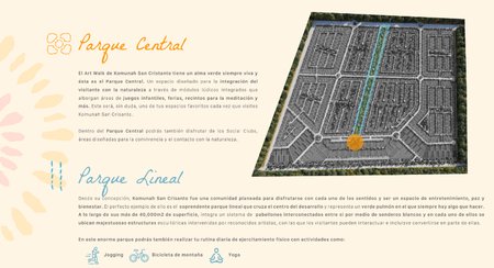 • Art Walk: Ubicado en el área comercial, conjugará en un espacio para apreciar esculturas de arte y vivir la experiencia de convivir con la naturaleza.