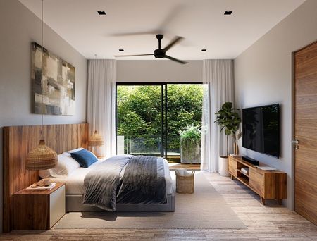 Estos hermosos estudios y departamentos de 2 habitaciones son perfectos para rentas vacacionales o como tu propio hogar en el paraíso. Cuentan con un diseño contemporáneo con arquitectura minimalista y materiales naturales que se mezclan sutilmente con el paisaje. Tienen una cocina equipada con encimeras de cuarzo y electrodomésticos de primera calidad, incluyendo una nevera, un microondas y una parrilla eléctrica con campana. Todas las residencias modernas se abren a un balcón o terraza privada con vistas a la ciudad y al jardín. Tienen closets empotrados en las recamaras y los estudios cuentan con una estantería que separa las áreas de estar y dormir. Estos departamentos tienen suelos de mármol y acabados de lujo que son duraderos y fáciles de mantener. Se ofrecen a la venta sin amueblar pero equipados con ventiladores de techo y aire acondicionado.