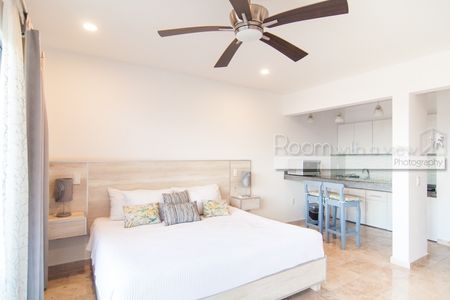 Ideal para solteros o parejas, este estudio lleno de luz solar es perfecto para rentas vacacionales o como su propio refugio caribeño. Cuenta con una cocina con barra de desayuno, microondas y cocina eléctrica. Este estudio tiene una zona de estar con un futón y una zona de descanso con una cama king-size, dos mesitas de noche incorporadas y un armario con puertas con espejo. Se abre a un balcón privado con vistas a la calle. Este condominio tiene pisos de cerámica y acabados de alta calidad que son duraderos y fáciles de mantener. Se ofrece amueblado y equipado con ventiladores de techo y aire acondicionado.