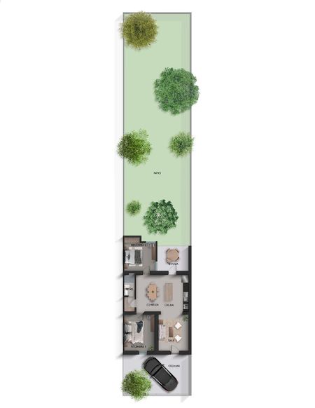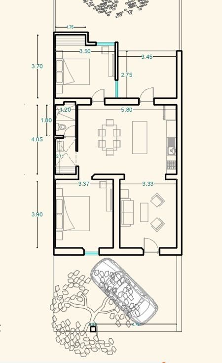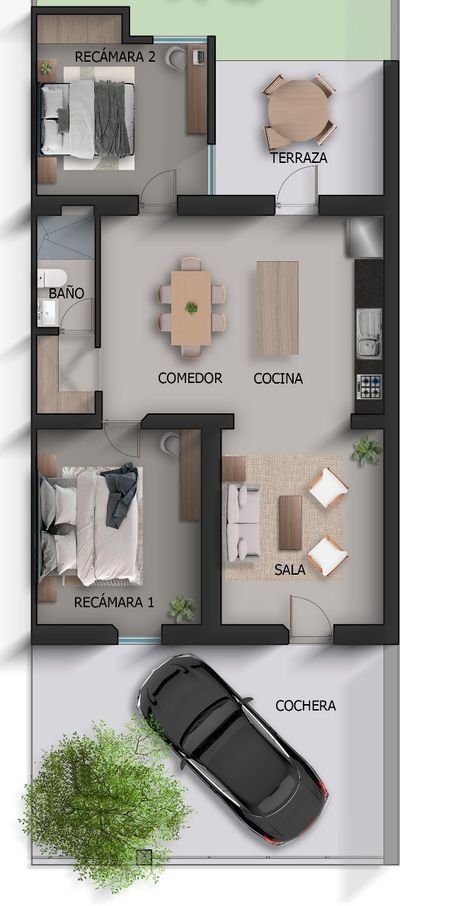 En el porche de entrada contará con un estacionamiento en diagonal, sala, comedor y cocina, dos recámaras, un baño completo, terraza y un amplio jardín que da opción a ampliar la casa a futuro.