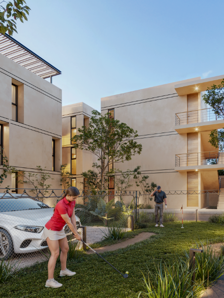 Roof Top con mobiliario, roof Top con alberca y camastros, terraza social, zona zen, green de golf,
