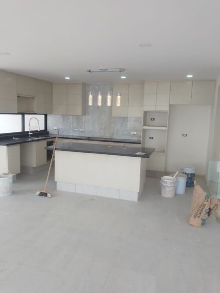 Cocina integral abierta equipada con torre de hornos y lavavajillas
