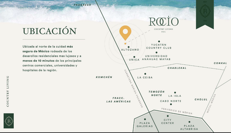 Roció Country Living se encuentra cerca de Yucatán Country, Altozano entre otros, fácil acceso a carretera Merida Progreso. A menos de 15 min de la Playa.
