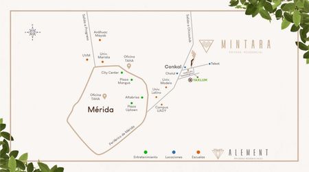 Mintara / Alement se encuentra en Conkal, zona de alta plusvalía y alta calidad de vida, con la tranquilidad de lo rural y los servicios de lo urbano. Se cuenta con acceso directo a zonas como Altabrisa, Universidades y el Anillo Periférico, además de carretera directa a la playa.