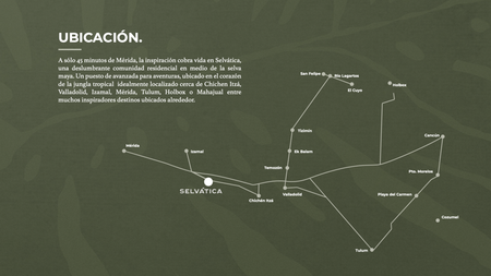 A sólo 45 minutos de Mérida, la inspiración cobra vida en Selvática, una deslumbrante comunidad residencial en medio de la selva maya. Un puesto de avanzada para aventuras, ubicado en el corazón de la jungla tropical idealmente localizado cerca de Chichen Itzá, Valladolid, Izamal, Mérida, Tulum, Holbox o Mahajual entre muchos inspiradores destinos ubicados alrededor.