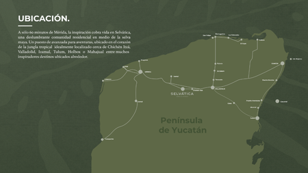 A sólo 45 minutos de Mérida, la inspiración cobra vida en Selvática, una deslumbrante comunidad residencial en medio de la selva maya. Un puesto de avanzada para aventuras, ubicado en el corazón de la jungla tropical idealmente localizado cerca de Chichen Itzá, Valladolid, Izamal, Mérida, Tulum, Holbox o Mahajual entre muchos inspiradores destinos ubicados alrededor.