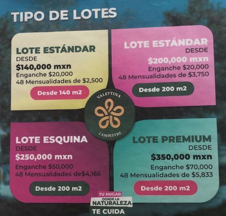 VENTA DE TERRENOS - VALENTINA CAMPESTRE - FACILIDADES PAGO, MENS. DE $2,500.00