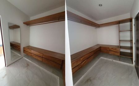 Cocina con gaveta inferiores y superiores con listón de madera, especieros y basureros extraible