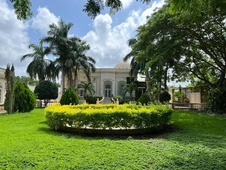 Áreas arboladas, una fuente central, alberca olímpica con sistema de sonido en el