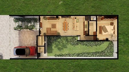 Único piso.- Cochera techada para dos autos, sala comedor corrido con cocina abierta y vista al jardín, baño de visitas, área de lavado y una recámara con espacio de closet y baño,