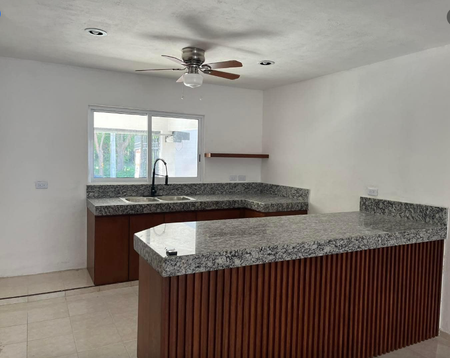 -Cocina con carpintería y meseta de granito blanco Tulum.