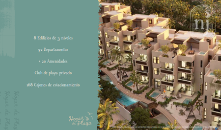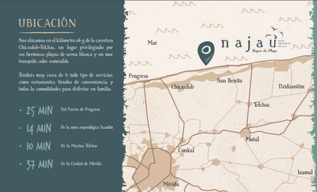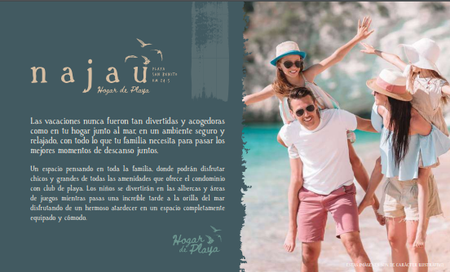 NAJAU consta de 8 edificios en la playa de 3 niveles mas Roof Top cada uno, que alojará 72 departamentos de 2 o 3 recámaras y cuarto de servicio, con múltiples amenidades tales como terrazas, alberca y áreas de juegos así como un club de playa privado.