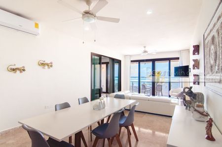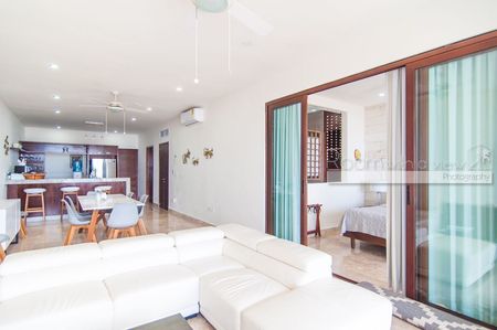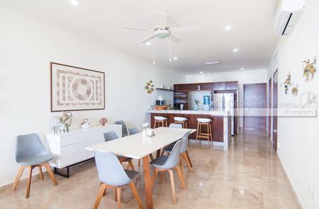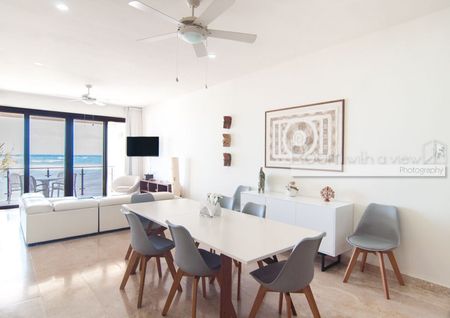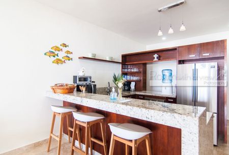 Este departamento con vista al mar se encuentra en un edificio frente a la playa muy cotizado en las costas de la Bahía de la Media Luna en la tranquila colonia de North Akumal. Este departamento está justo frente a la playa y a pocos minutos de la hermosa Laguna Yalku. Akumal es uno de los lugares favoritos para los buceadores, ya que cuenta con un sistema de arrecifes de fácil acceso lleno de coloridos corales vivos y una abundante vida marina. Este pequeño pueblo junto al mar cuenta con una tienda de buceo de servicio completo, una pequeña tienda de comestibles y un puñado de cafeterías y restaurantes con excelente comida y música en vivo.