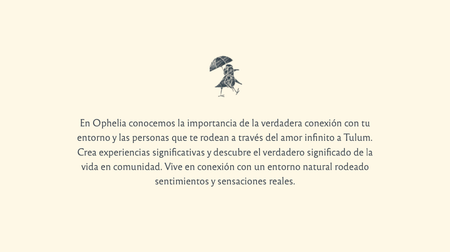 En Ophelia conocemos la importancia de la verdadera conexión con tu entorno y las personas que te rodean a través del amor infinito a Tulum. Crea experiencias significativas y descubre el verdadero significado de la vida en comunidad. Vive en conexión con un entorno natural rodeado sentimientos y sensaciones reales.
