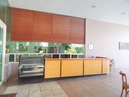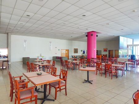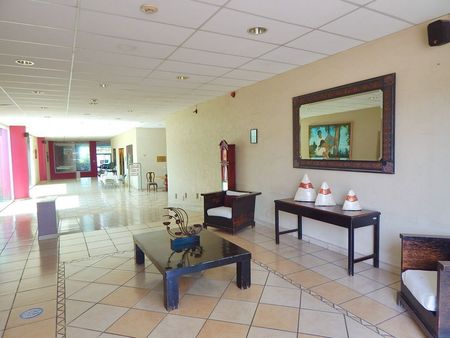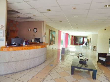 El hotel cuenta con: lobby, recepción con sala de espera, área de mostrador con baño, dos oficinas con baño, amplios pasillos con jardines interiores, capilla, salón de eventos, dos salones ejecutivos, restaurante bar con baños para hombres y para mujeres. Terraza para cafetería, cocina, cuarto lavaloza, cuarto frío, almacén y comedor de empleados. Cuarto lavandería y baños trabajadores hombres y mujeres. Al fondo tiene jardín con juegos infantiles, y alberca con cuatro módulos de jacuzzi para dos personas cada uno.