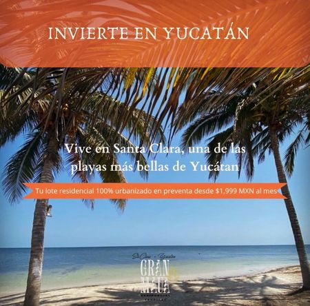 Oportunidad de inversión en Yucatán, terrenos residenciales, cerca de la playa, financiamiento propio enganche $36,000 y 60 mensualidades de $1,999 . Terrenos con 100% de certeza legal.