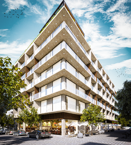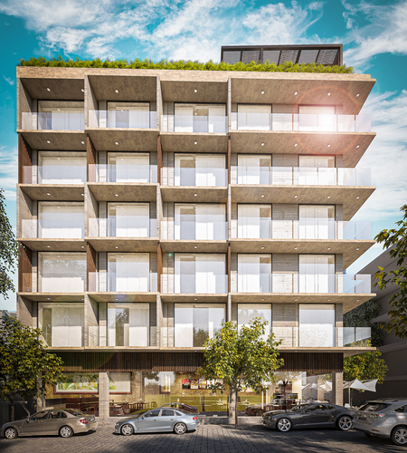 El acceso peatonal y vehicular se realizan por la 5ta. avenida. El proyecto se plasma como unidad habitacional conformada por 50 departamentos y 35 habitaciones, así como áreas privativas y como áreas comunes: