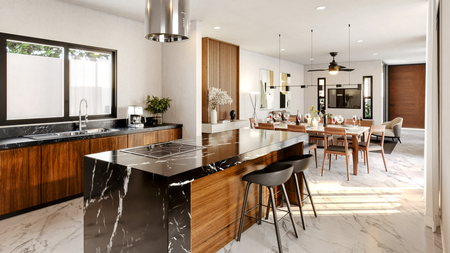 - Cocina integral con cubierta de granito VIA LACTEA, alacena, barra desayunador, parrilla de 6 quemadores