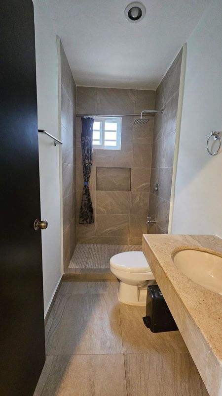 - Baño con inodoro de 1 pieza, lavabo con meseta de cantera y regadera con llave mezcladora