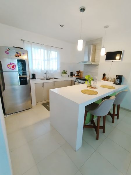-La cocina es uno de sus principales puntos fuertes de la casa ya que es remodelada con mesa desayunadora muy amplia con lámparas decorativas.