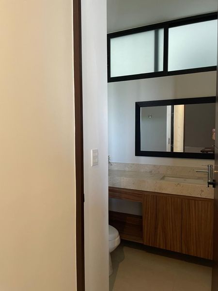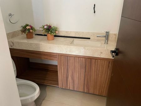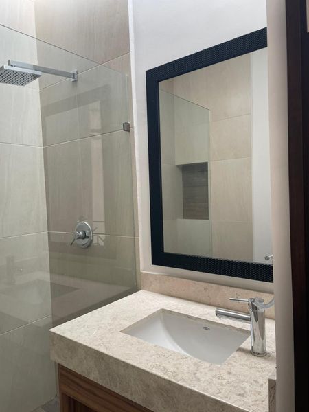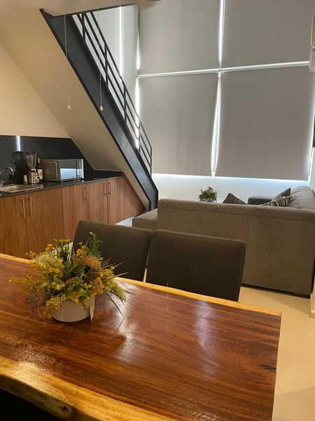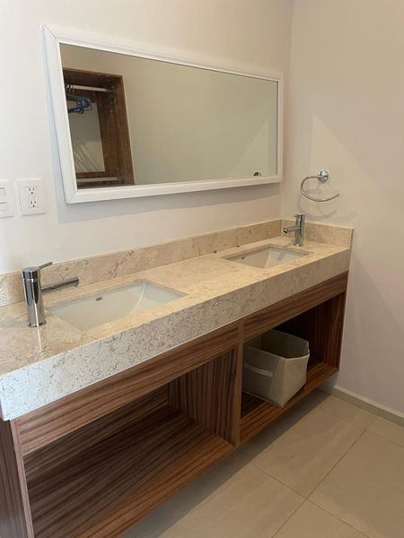 Planta baja cuenta con sala completa, con excelente vista, comedor en madera de Tzalam, cocina con barra de granito, equipada con horno de microondas, parrilla eléctrica y campana, enseres domésticos, refrigerador inverter, área de lavado con lavasecadora inverter, 4 aires acondicionados inverter por lo que todo el departamento está climatizado