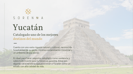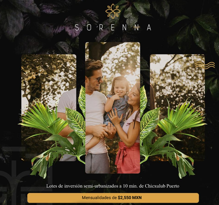 SORENNA, es un desarrollo de lotes de inversión semi urbanizados y urbanizados sin régimen de condominio, rodeados de naturaleza. Cuenta con excelente ubicación en una zona con gran crecimiento. Está a 3.5 km de la carretera a Chicxulub Puerto y 8 minutos de Chicxulub Puerto, una de las playas más prestigiosas de nuestro estado, así como a minutos de centros comerciales, hospitales y universidades en el norte de la ciudad. Está rodeado de desarrollos que garantizan una excelente plusvalía y excelente infraestructura de carreteras nuevas como por ejemplo la ampliación de Tixcuytun-Conkal y Conkal-Chicxulub.