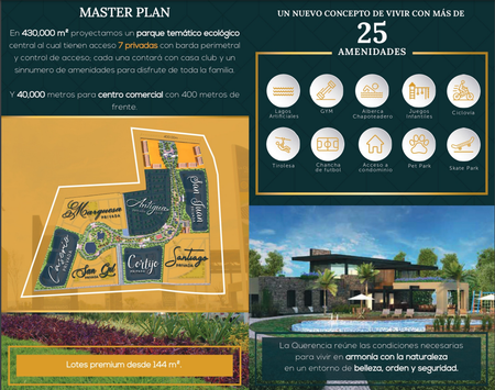 Aprovecha precios de preventa de terrenos ubicados a sólo 3 km del centro de Querétaro. En fraccionamiento nuevo con 7 cluster, cada uno con alberca, casa club, cancha de paddle, salón de eventos, gym, pilates, terraza para yoga, y más, aparte de las amenidades generales como ciclovías y cuerpos de agua, pista de futbol, área de jogging, pet park, tirolesa y más. Atractivos planes de financiamiento directo y ofertas en pago de contado. Cerca de zona de hospitales.