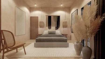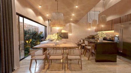 De estilo moderno y con materiales de canteras de la región en diferentes puntos estratégicos de la construcción para resaltar la belleza natural, así como muros con Chukum