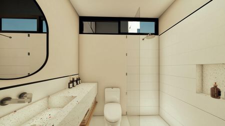 Baños con accesorios marca Helvex, recubrimientos cerámicos, fijos de cristal templado y mesetas de terrazo.