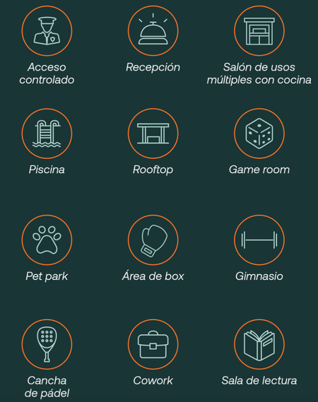 recepción, caseta con plumas de acceso, salón de usos múltiples, cocina para el salón, área grill, área de juegos.