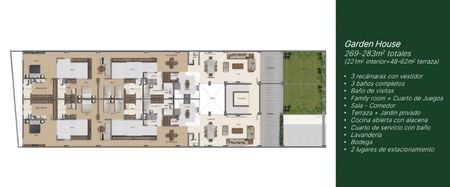De 3 recamaras con vestidor y baño, baño de visitas , family + cuarto de juegos, terraza privada, cocina abierta, cuarto de servicio, área de lavado, bodega, 2 estacionamientos
