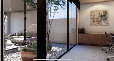 jardín posterior y terraza de 40 m2, incluye asador; amplio estudio con vista a jardín interno, sala de televisión
