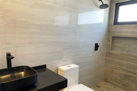 Equipamiento: Placa de granito en baños, cancelería aluminio 3”, cisterna 2,800 lts, cocina integral con cubierta de granito.