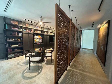 14. Recibidor: Con pared de mármol y una cascada de agua.