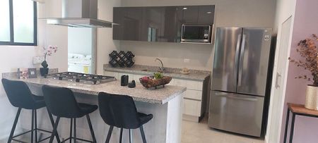 PLANTA BAJA. MEDIO BAÑO, SALA COMEDOR CON TERRAZA Y SALIDA AL JARDÍN, COCINA INTEGRAL EQUIPADA CON PARRILLA, ALACENAS, CUBIERTA DE GRANITO, CUARTO DE LAVADO,JARDÍN 37 MTS.APROX.