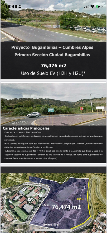 Ubicación privilegiada en la primera sección de bugambilias, en esquina, tiene 330 m2 de frente a la calle del colegio ALPES-CUMBRES,adicional a este cuenta con 596 m2 de frente a la avenida que sube y baja a la segunda sección de bugambilias, es una vialidad de 4 carriles. La zona es residencial Medio-Alto por lo que es muy atractiva la plusvalía de la inversión a realizar.
