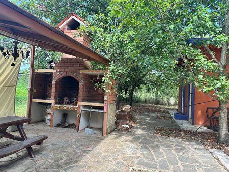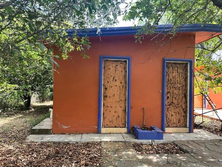 En el área exterior se encuentra una palapa con asador, baño exterior, bodega y un terreno con árboles, principalmente naranjos y encinos, que aportan sombra y frescura al entorno.