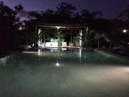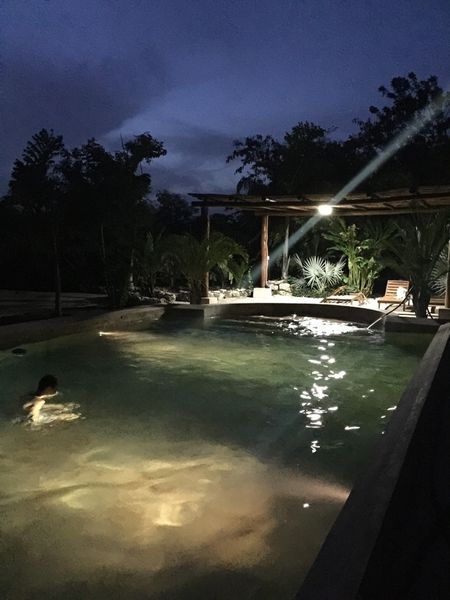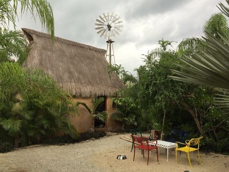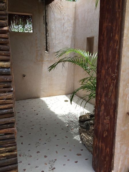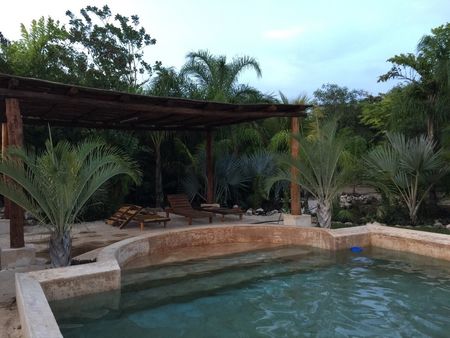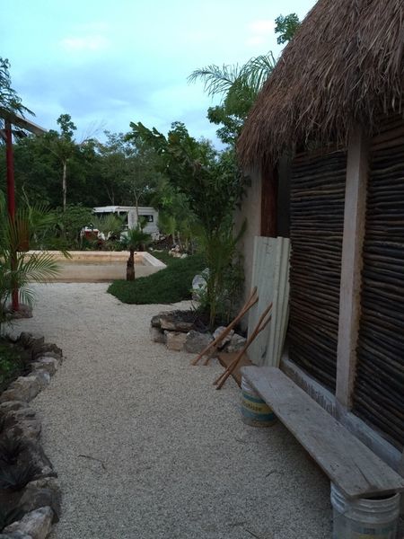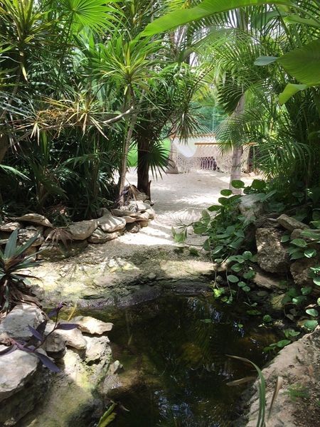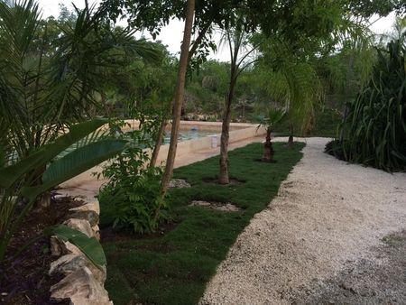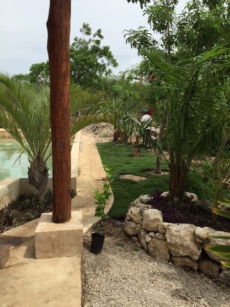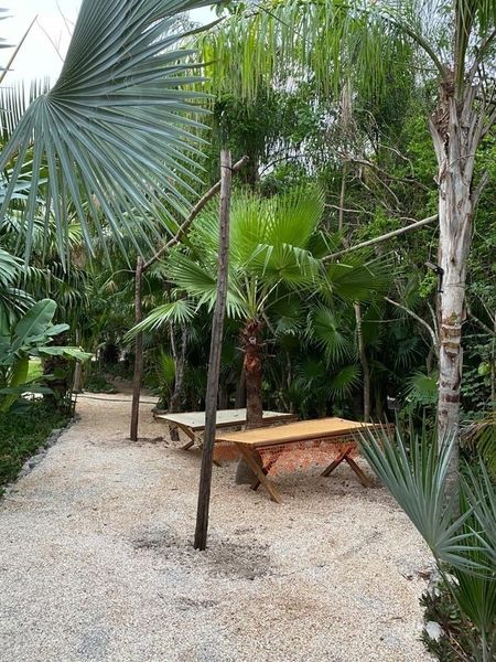 Con abundante vegetación, palmeras, casa Maya, baños de hombres y mujeres, cancha de fútbol, palapa con mesa y asador, caminos sembrados de bellas plantas, piscina con terraza.