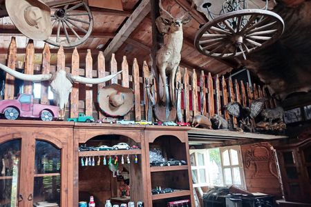 1 cabaña con sala, cocina, planta alta y un cuarto.