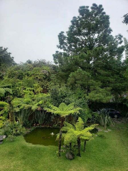 Áreas verdes: 1,400m2 de jardín cuidado, distribuidos en dos terrazas que rodean la casa, incluyendo un estanque con fuente y carpas.