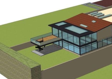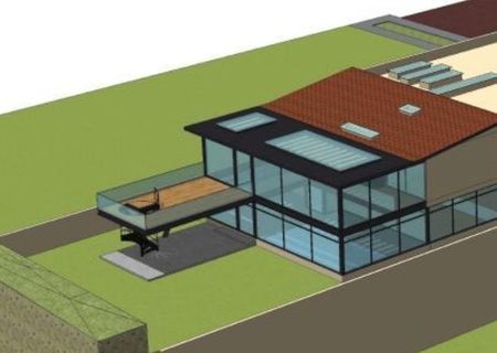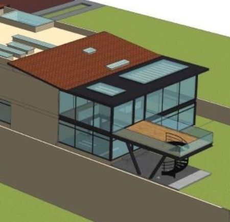 Gimnasio panorámico techado y escalera al jardín,