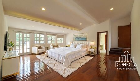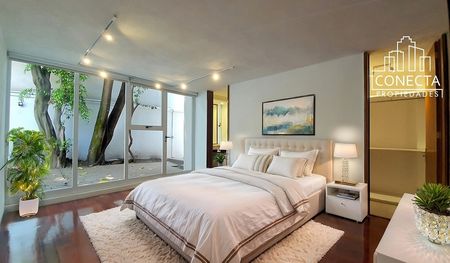 Esta casa destacan 2 recámaras en planta baja, cada una con baño propio, una con vestidor y otra con walking clóset, ambas con salida a terraza y jardín plano de 140 m2.