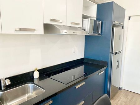 Cocina integral con granito campana, horno, estufa y refrigerador