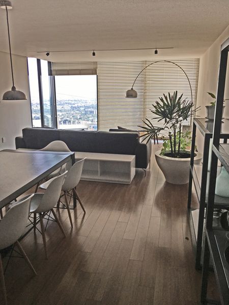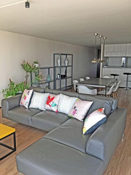 Departamento amueblado con vista a la ciudad desde lo alto de la zona Diamante. Destacan sus excelentes acabados y diseño moderno. 2 recámaras, 2.5 baños, sala de TV, sala/comedor, terraza, cocina integral, área de lavado, 2 cajones de estacionamiento techados y bodega.