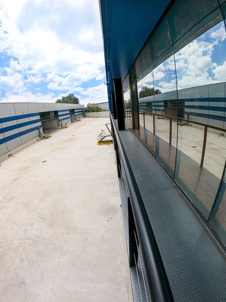 • Fachada exterior de oficinas con aluminio y cristal. cada bodega cuenta con un mezanine para que el
