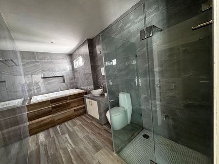Recámara principal con baño completo, closet vestidor, tina de hidromasaje y acceso hacia amplio balcón con vista panorámica.
