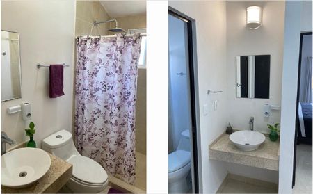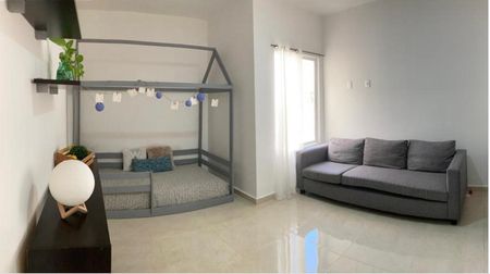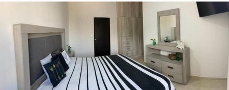 Hab Principal: con recamara completa color gris con burós, luna y cómoda con espejo , cama King Size , closet completo, Smart TV 30” y baño privado .