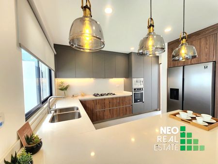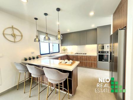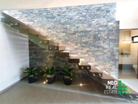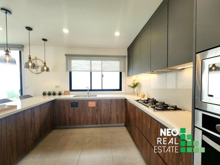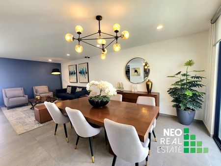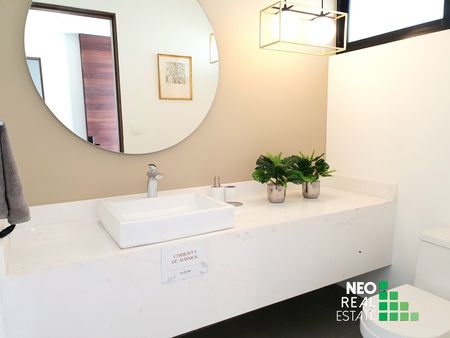 Parte de los detalles que hacen unica esta bella residencia son: su puerta pricipal de parota, cocina integral con cubierta de cuarzo, sus escaleras flotantes con huella de madera y barandal cristal templado.