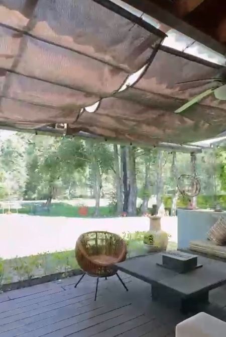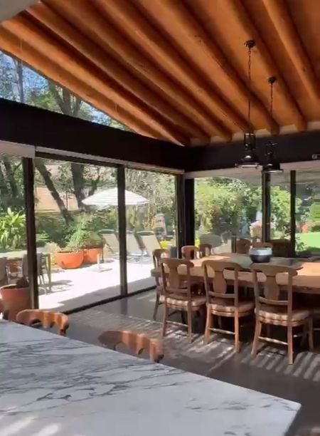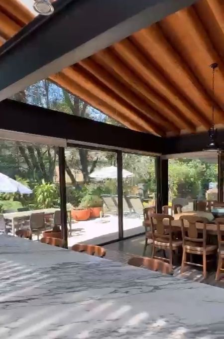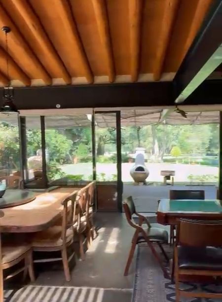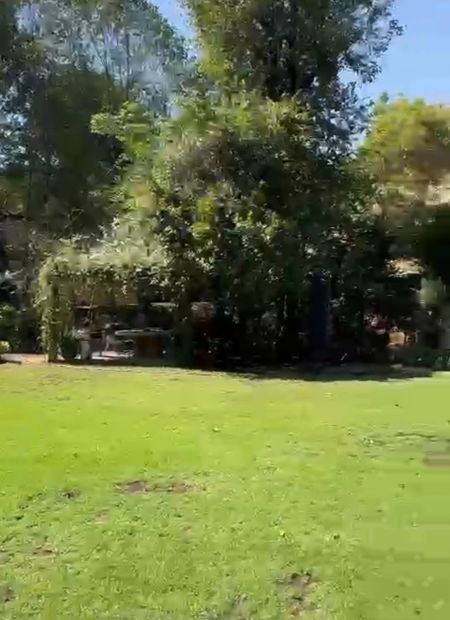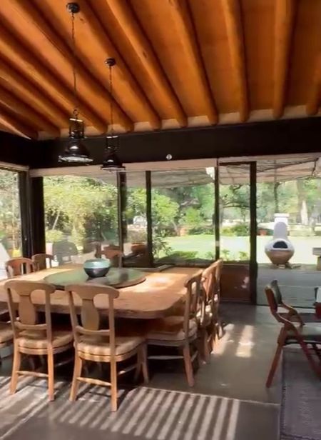 Bello jardín, comedor campestre con encantadora Veranda, junto al río, área “techada” solamente con plantas y enredaderas y gran mesa de mármol redonda, para 12 personas y lazy susan, para comidas y almuerzos familiares al aire libre.