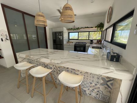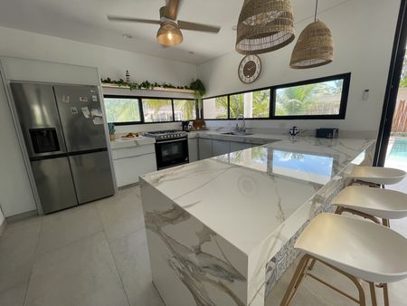 Cocina equipada con barra y meseta de mármol, área de alacena, gavetas, refrigerador que hace hielo, congelador a parte, estufa con horno, horno de microohondas, se entregan vasos, platos, cubiertos y ollas.